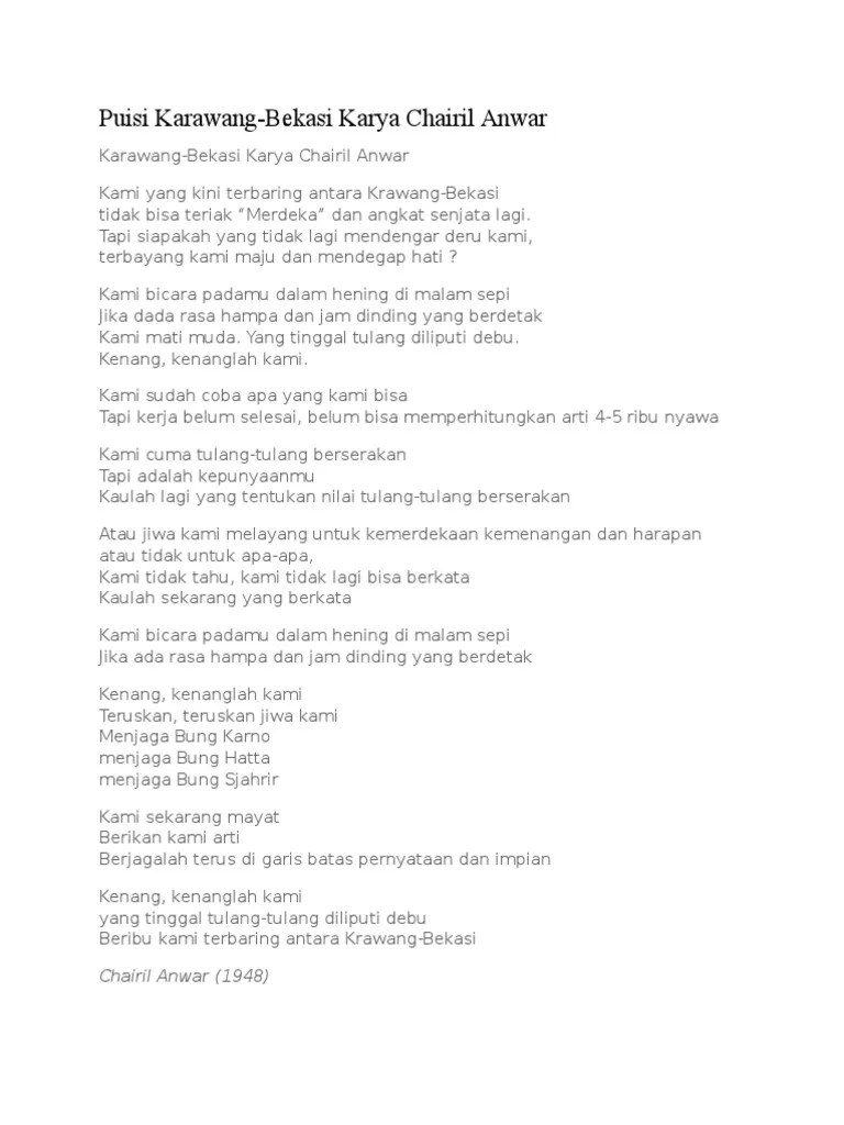 Penulis Puisi Yang Berjudul Karawang Bekasi Adalah / Struktur Fisik Puisi Karawang Bekasi Dan Surat Dari Ibu Halaman All Kompas Com : Penulis puisi yang berjudul karawang bekasi adalah.. Maybe you would like to learn more about one of these? Penulis puisi yang berjudul karawang bekasi adalah. We did not find results for: Check spelling or type a new query.